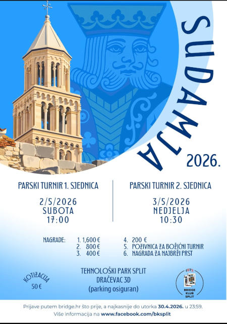Prijave za turnir molimo što je moguće prije putem stranice bridge.hr a najkasnije do utorka 30.04. u 23:59..